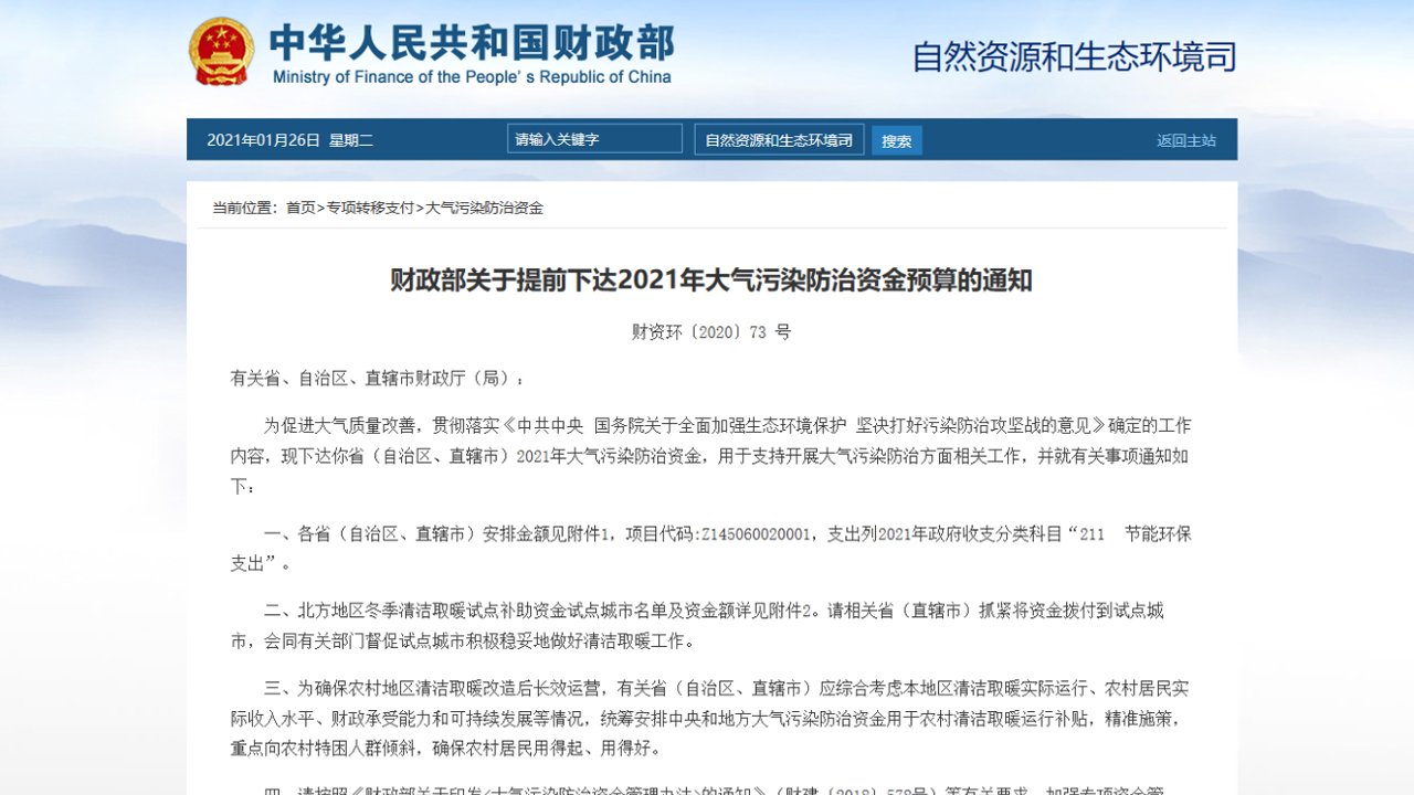 ? ? ? 近日,財政部發布《關于提前下達2021年大氣污染防治資金預算的通知》,附件明確2021年北方地區冬季清潔取暖試點補助資金試..